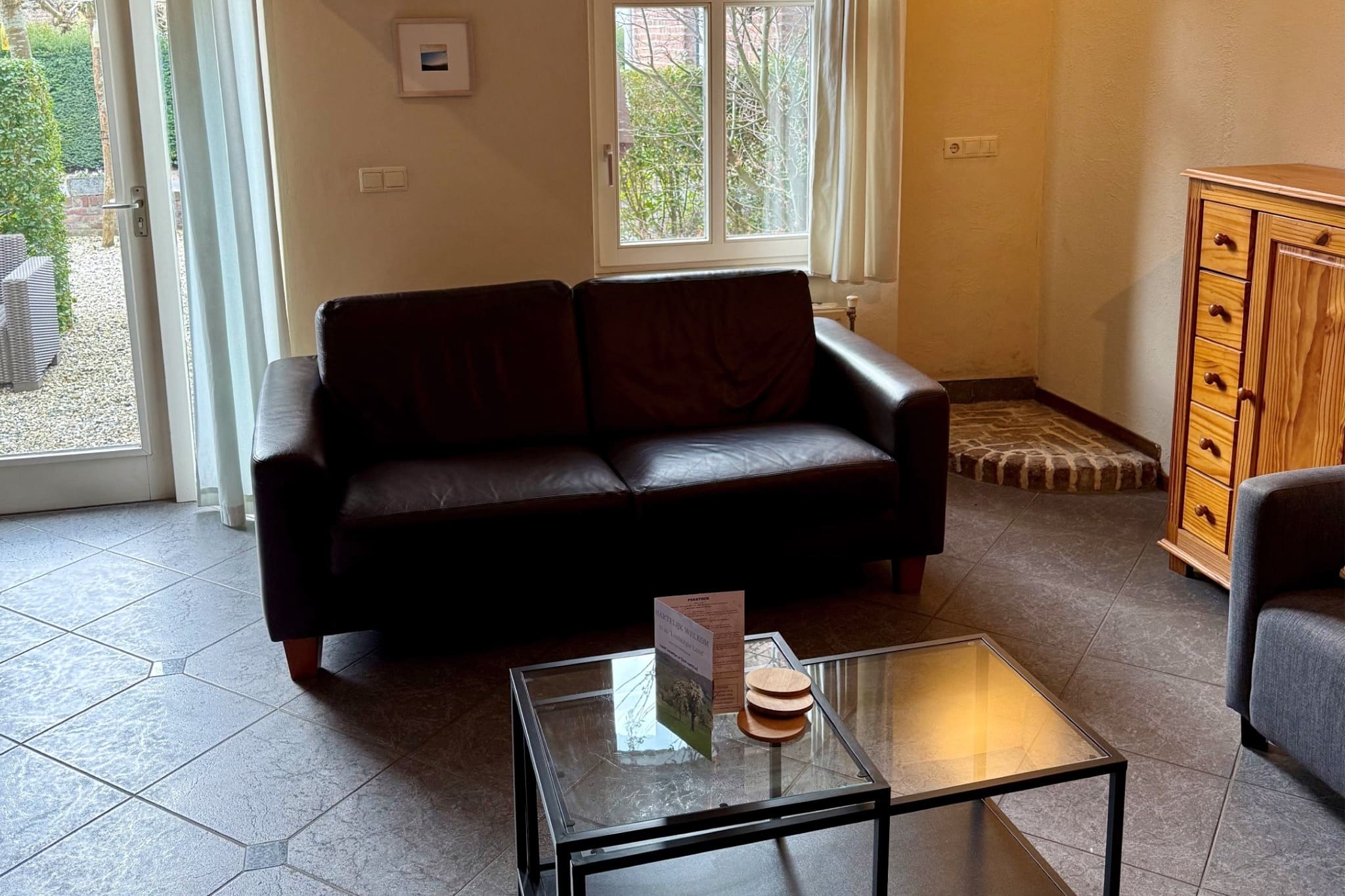Een woonkamer met grote glazen deur naar buiten, ideaal om lekker te ontspannen op eigen afgescheiden terras. Hierdoor ook veel lichtinval in het appartement.