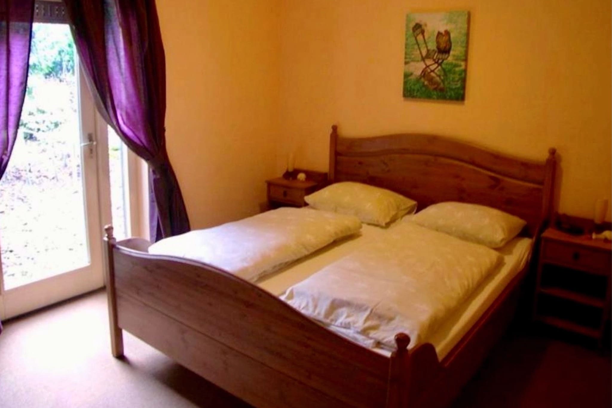 Comfortabele slaapkamer met een heerlijk twee-persoons bed met 2e eigen terrasje aan de slaapkamer te bereiken via slaapkamerdeur.