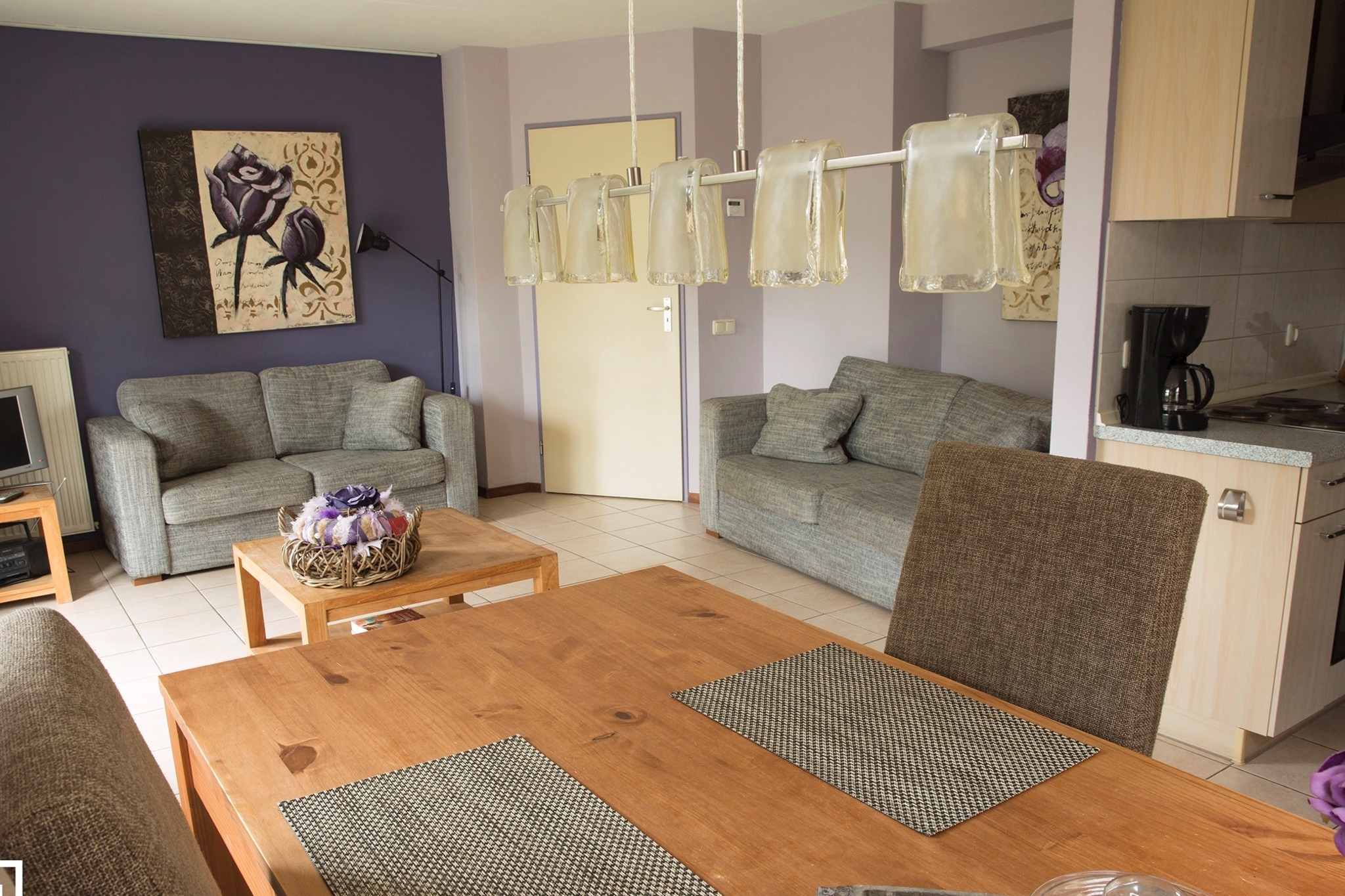 Woonkamer met grote glazen deur naar buiten, ideaal om lekker te ontspannen op eigen afgescheiden terras. Hierdoor ook veel lichtinval in het appartement.
