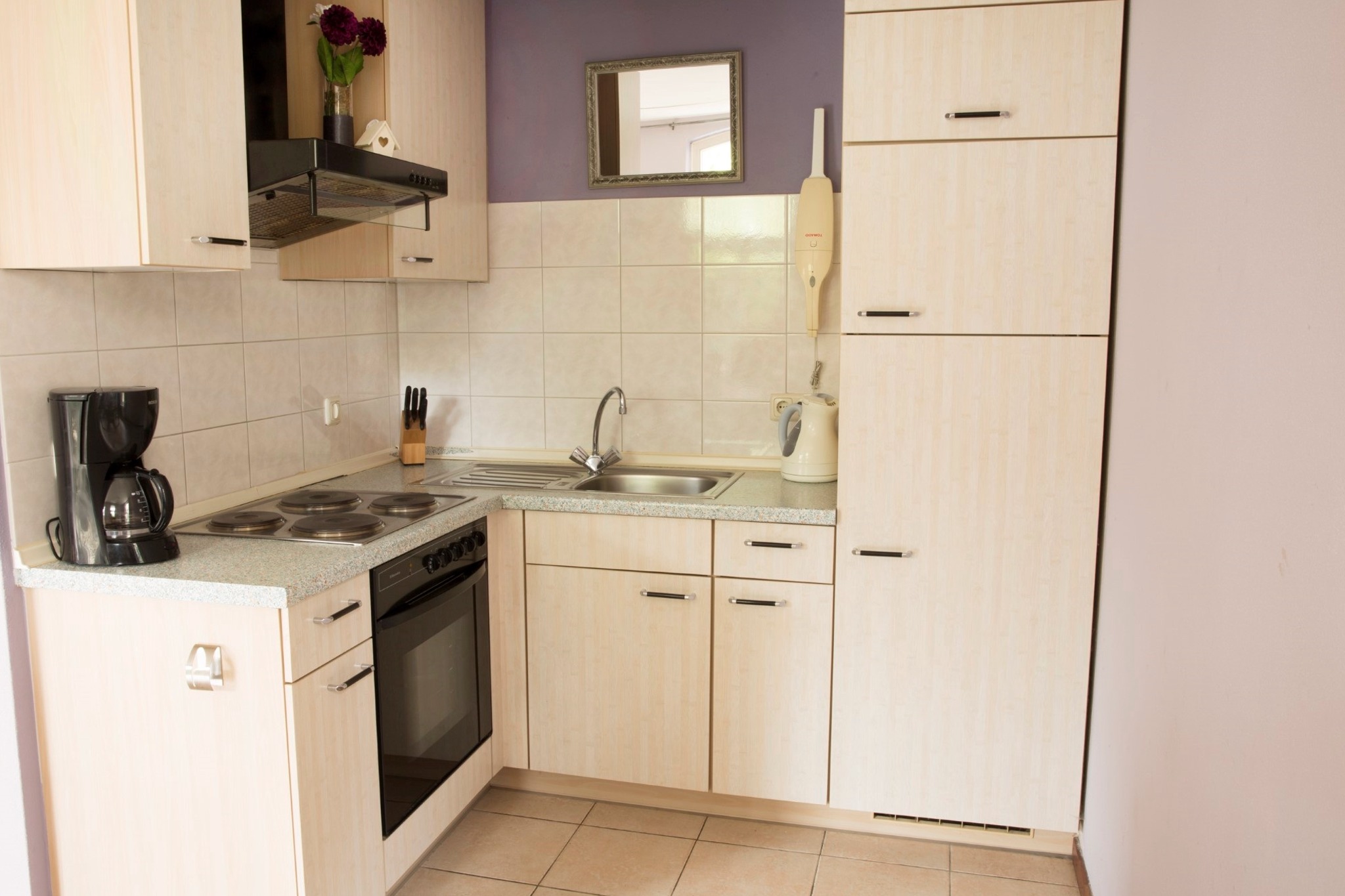 De afgescheiden open keuken is van alle gemakken voorzien.