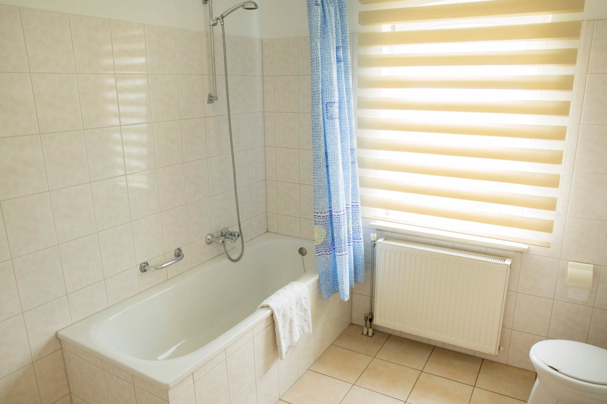 De ruime badkamer is uitgerust met een bad en toilet.